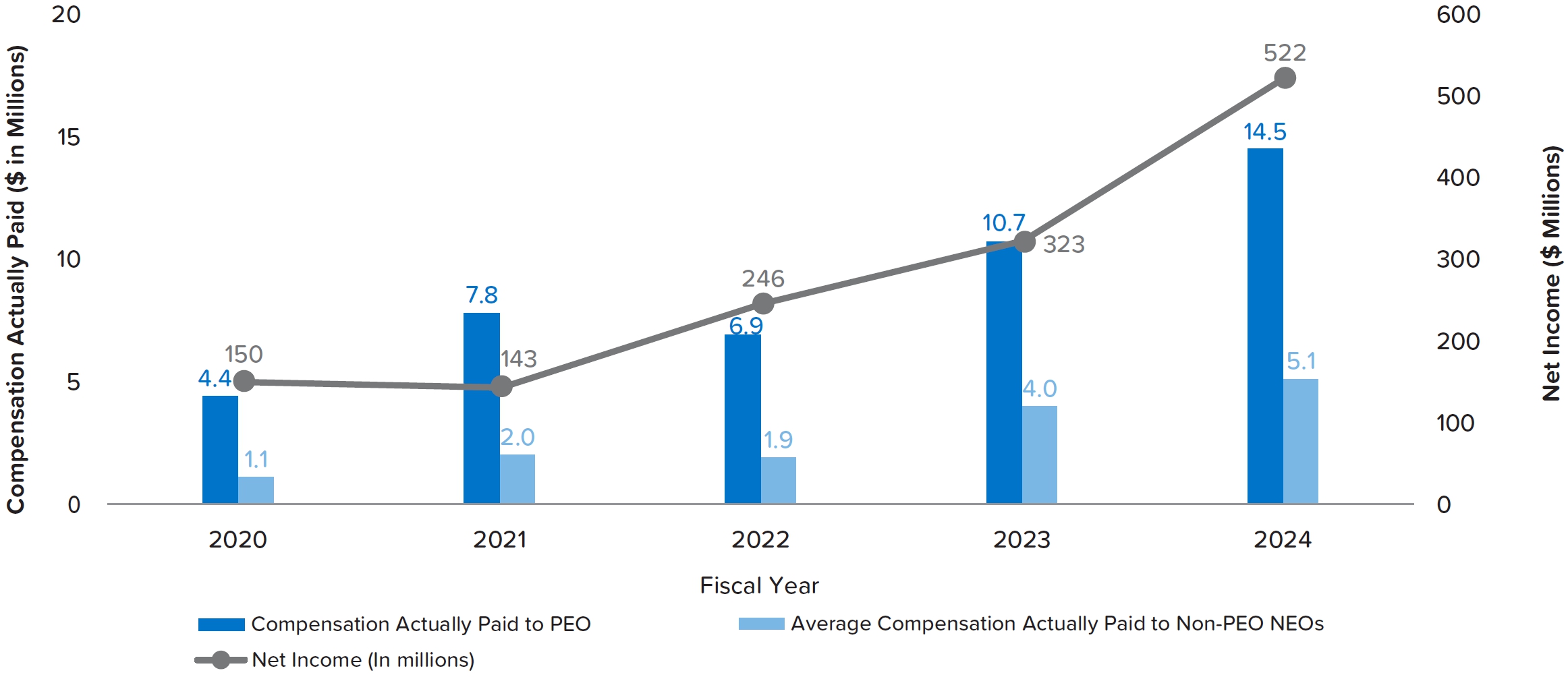 Relationship between: (a) the compensation actually paid to the Company’s PEO and (b) the average of the compensation actually paid to the Company’s other NEOs to (ii) the net income of the Company over the five years presented in the table.