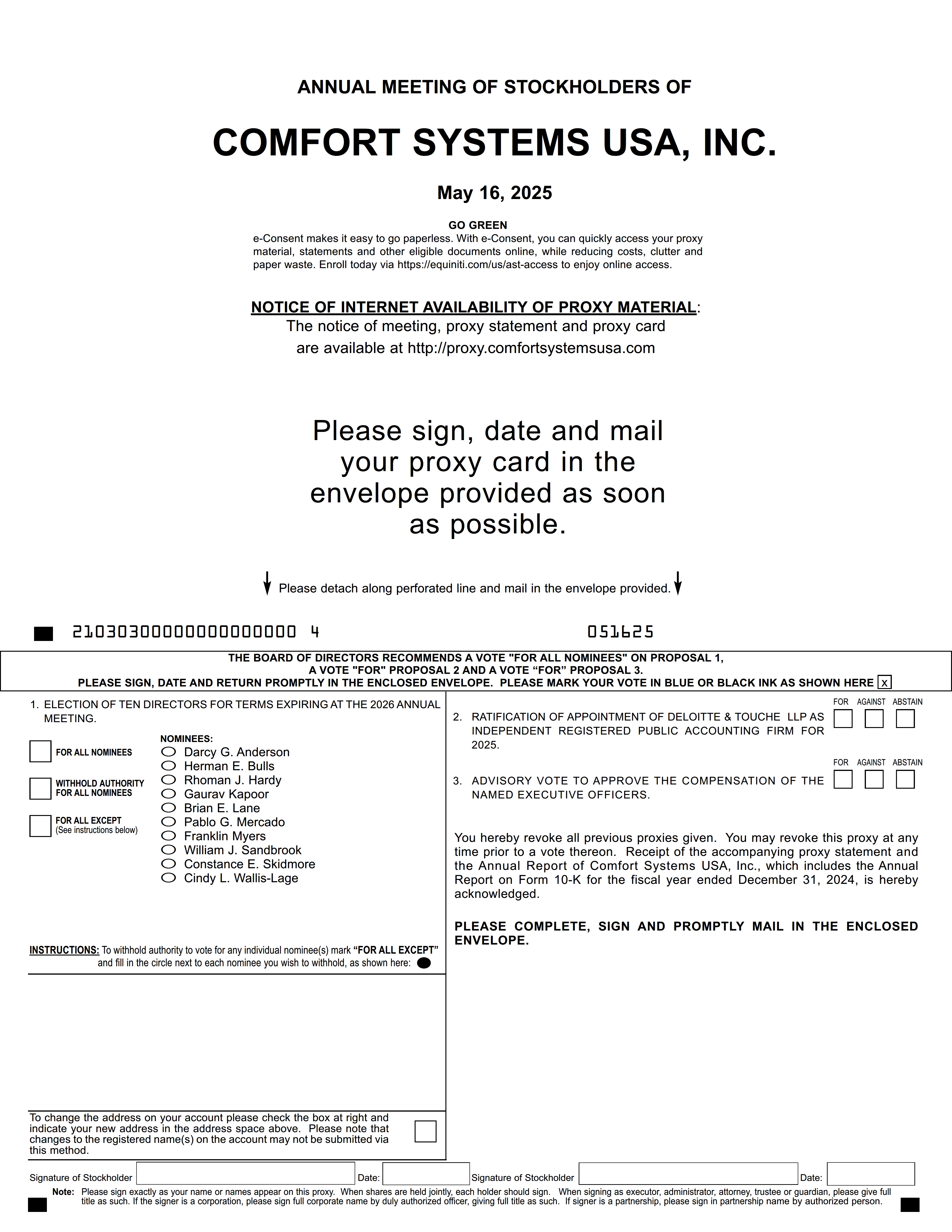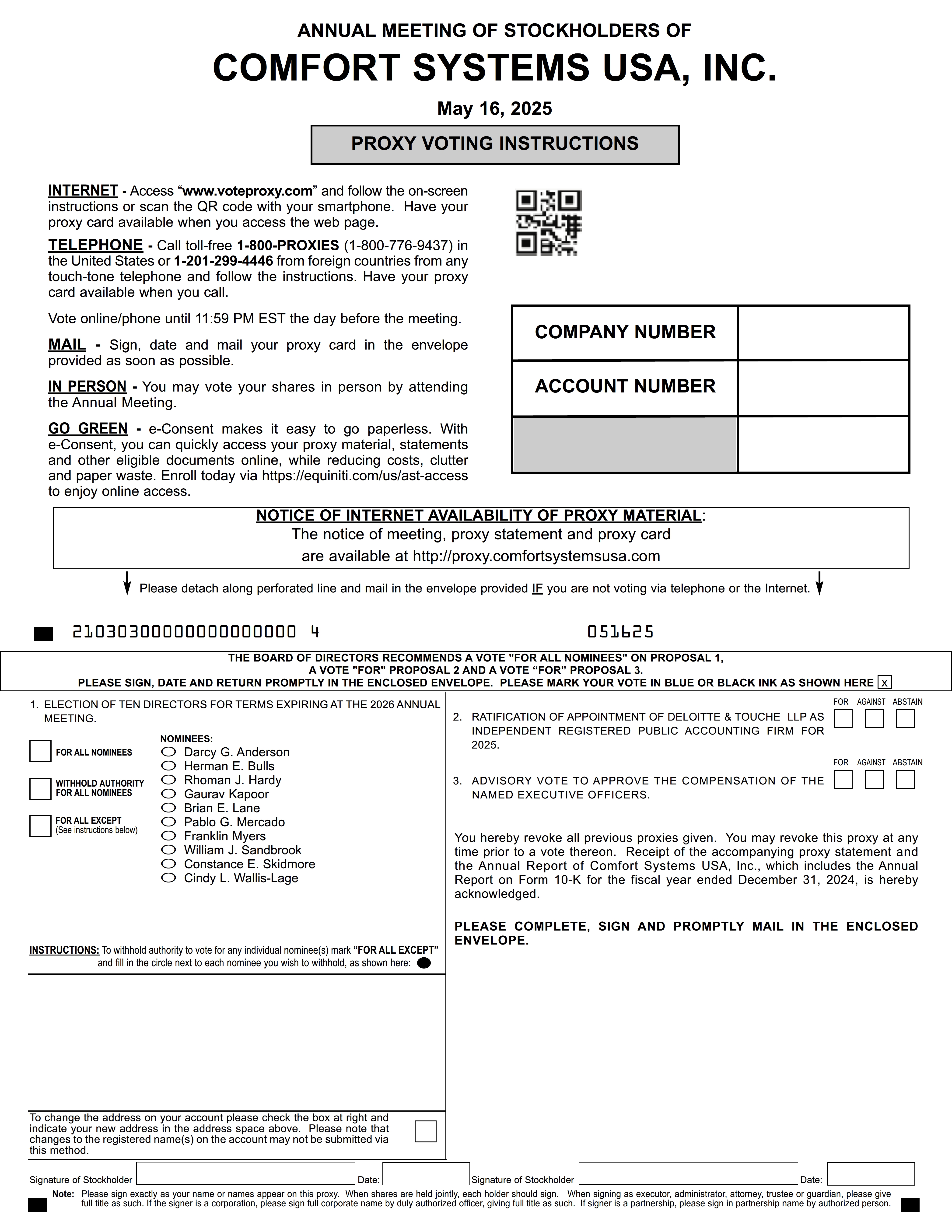 ANNUAL MEETING OF STOCKHOLDERS OF COMFORT SYSTEMS USA, INC. May 16, 2025 GO GREEN e-Consent makes it easy to go paperless. With e-Consent, you can quickly access your proxy material, statements and other eligible documents online, while reducing costs, clutter and paper waste. Enroll today via https://equiniti.com/us/ast-access to enjoy online access. NOTICE OF INTERNET AVAILABILITY OF PROXY MATERIAL: The notice of meeting, proxy statement and proxy card are available at http://proxy.comfortsystemsusa.com Please sign, date and mail your proxy card in the envelope provided as soon as possible. Please detach along perforated line and mail in the envelope provided. 21030300000000000000 4 051625 A VOTE "FOR" PROPOSAL 2 AND A VOTE “FOR” PROPOSAL 3. PLEASE SIGN, DATE AND RETURN PROMPTLY IN THE ENCLOSED ENVELOPE. PLEASE MARK YOUR VOTE IN BLUE OR BLACK INK AS SHOWN HERE 1. ELECTION OF TEN DIRECTORS FOR TERMS EXPIRING AT THE 2026 ANNUAL MEETING. FOR ALL NOMINEES FOR WITHHOLD ALL NOMINEES AUTHORITY FOR ALL EXCEPT (See instructions below) NOMINEES: Darcy G. Anderson Herman E. Bulls Rhoman J. Hardy Gaurav Kapoor Brian E. Lane Pablo G. Mercado Franklin Myers William J. Sandbrook Constance E. Skidmore Cindy L. Wallis-Lage INSTRUCTIONS: To withhold authority to vote for any individual nominee(s) mark “FOR ALL EXCEPT” and fill in the circle next to each nominee you wish to withhold, as shown here: 2. RATIFICATION OF APPOINTMENT OF DELOITTE & TOUCHE LLP AS INDEPENDENT REGISTERED PUBLIC ACCOUNTING FIRM FOR 2025. 3. ADVISORY VOTE TO APPROVE THE COMPENSATION OF THE NAMED EXECUTIVE OFFICERS. FOR AGAINST ABSTAIN You hereby revoke all previous proxies given. You may revoke this proxy at any time prior to a vote thereon. Receipt of the accompanying proxy statement and the Annual Report of Comfort Systems USA, Inc., which includes the Annual Report on Form 10-K for the fiscal year ended December 31, 2024, is hereby acknowledged. PLEASE COMPLETE, SIGN AND PROMPTLY MAIL IN THE ENCLOSED ENVELOPE. To indicate change your the new address address on your in the account address please spacecheck above. thePlease box at note right and that changes this method. to the registered name(s) on the account may not be submitted via Signature of Stockholder Date: Signature of Stockholder Date: Note: Please sign exactly as your name or names appear on this proxy. When shares are held jointly, each holder should sign. When signing as executor, administrator, attorney, trustee or guardian, please give full title as such. If the signer is a corporation, please sign full corporate name by duly authorized officer, giving full title as such. If signer is a partnership, please sign in partnership name by authorized person.