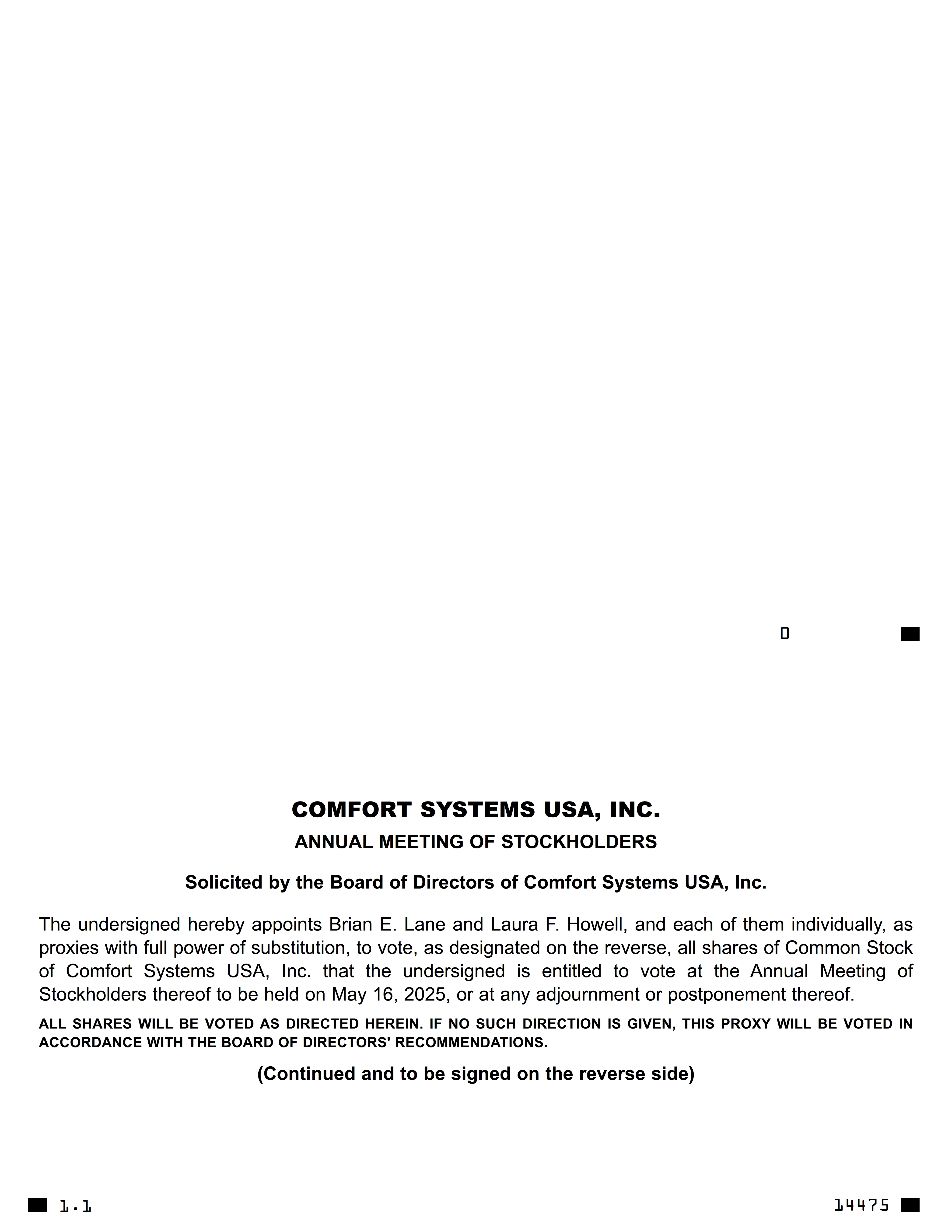 COMFORT SYSTEMS USA, INC. ANNUAL MEETING OF STOCKHOLDERS Solicited by the Board of Directors of Comfort Systems USA, Inc. The undersigned hereby appoints Brian E. Lane and Laura F. Howell, and each of them individually, as proxies with full power of substitution, to vote, as designated on the reverse, all shares of Common Stock of Comfort Systems USA, Inc. that the undersigned is entitled to vote at the Annual Meeting of Stockholders thereof to be held on May 16, 2025, or at any adjournment or postponement thereof. ALL SHARES WILL BE VOTED AS DIRECTED HEREIN. IF NO SUCH DIRECTION IS GIVEN, THIS PROXY WILL BE VOTED IN ACCORDANCE WITH THE BOARD OF DIRECTORS' RECOMMENDATIONS. (Continued and to be signed on the reverse side) 1.1 14475